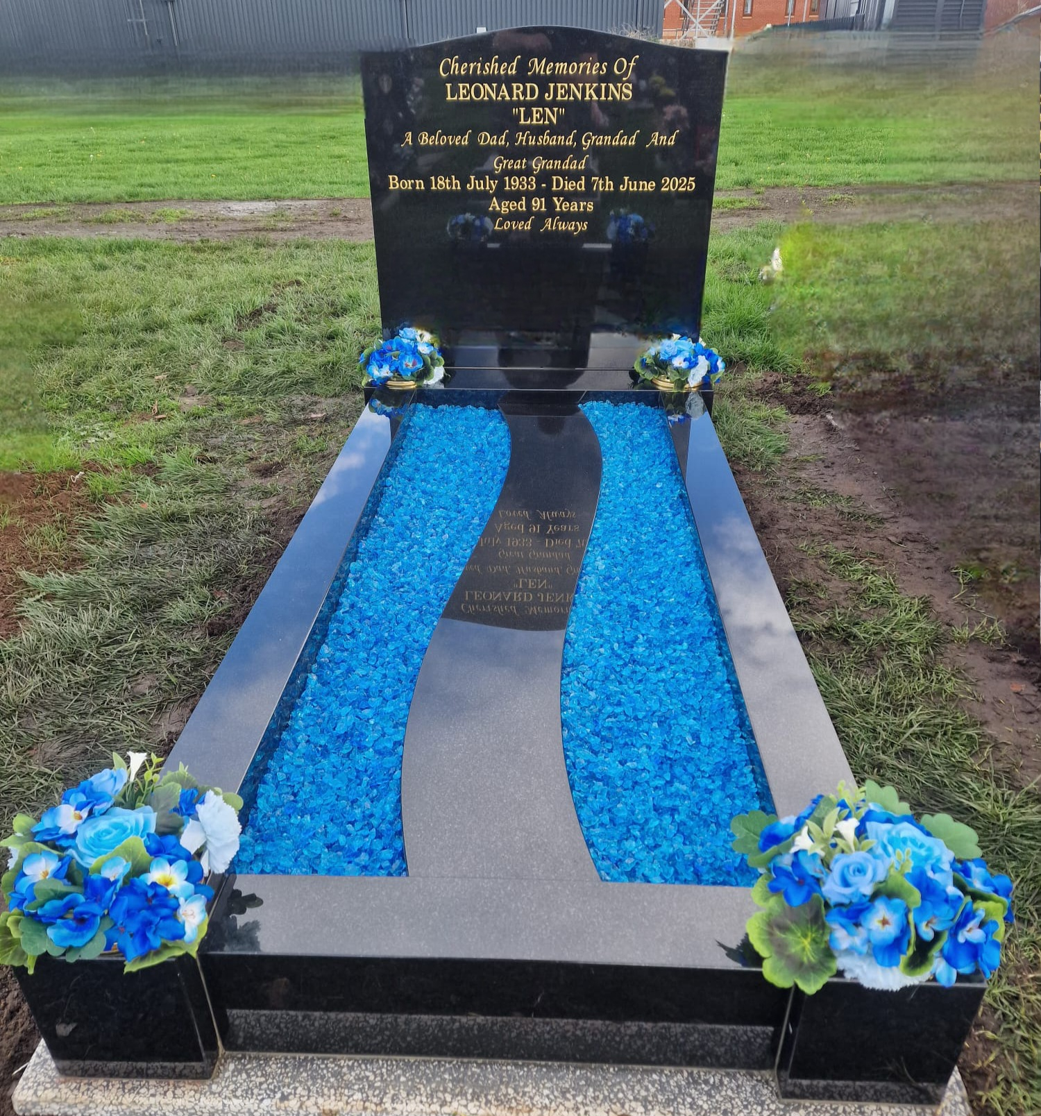 Black granite memorial with pathway and blue chippings
