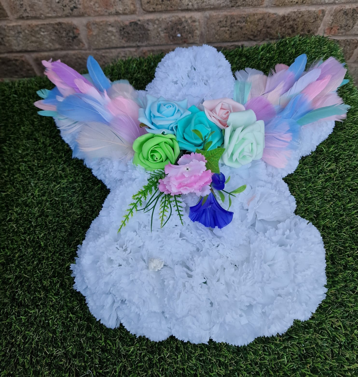 Children's flowers - Angel with Pale Blue Carnations and personalised sash. Also available in Pink and White